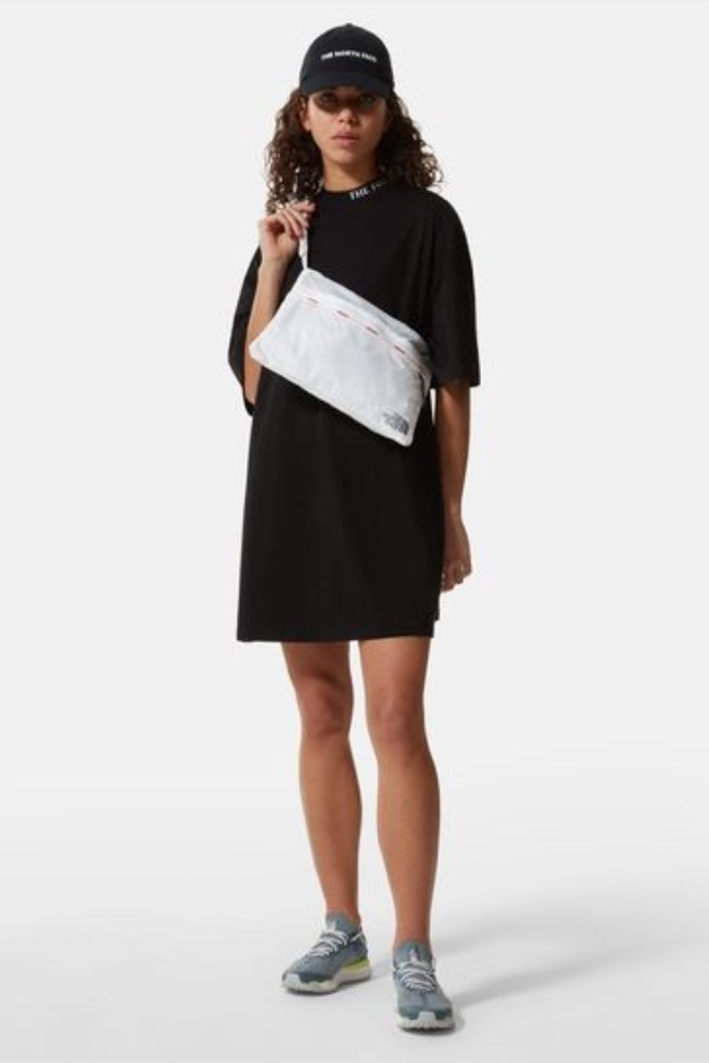 فستان أنيق ومريح من القطن 100٪ بأكمام قصيرة للاستمتاع بأيام الصيف. طوق ذو علامة تجارية منسوجة من الجاكار. شعار Tnf على ظهره.